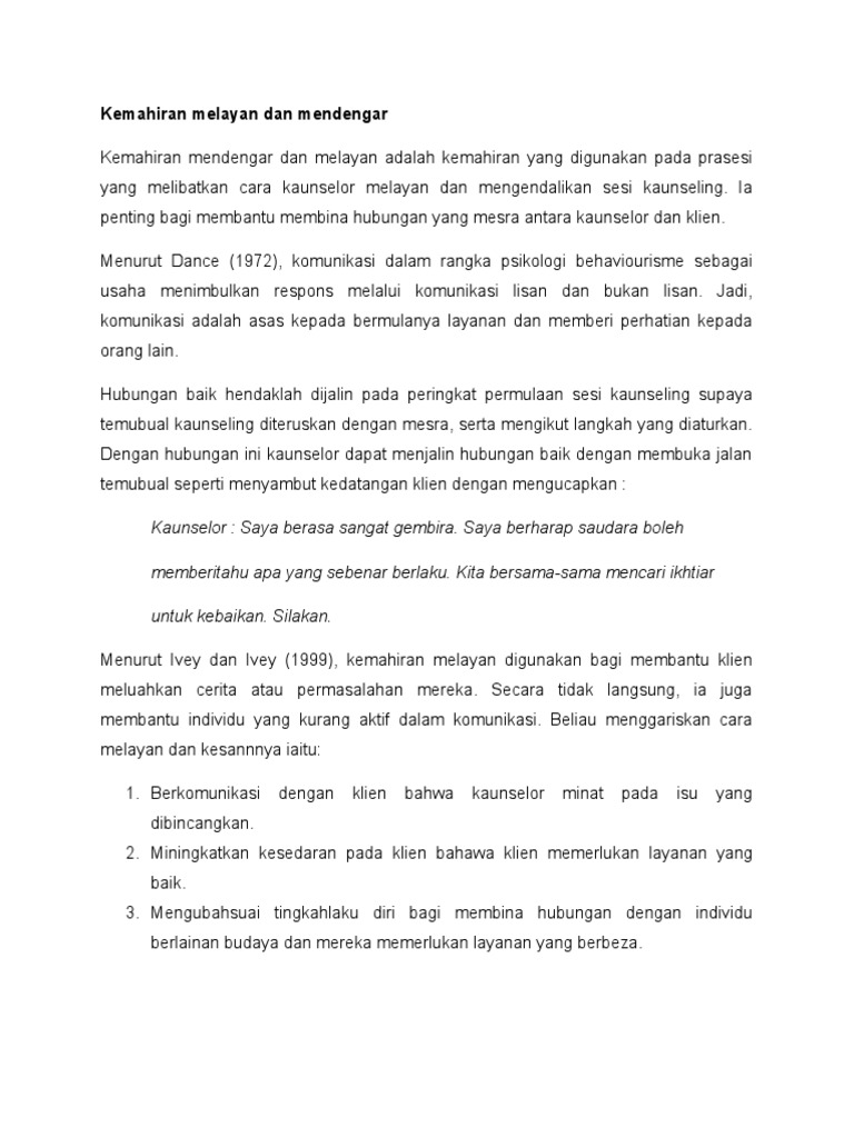 Kemahiran Mendengar Dan Melayan Adalah Kemahiran Yang Digunakan Pada Prasesi Yang Melibatkan Cara Kaunselor Melayan Dan Mengendalikan Sesi Kaunseling
