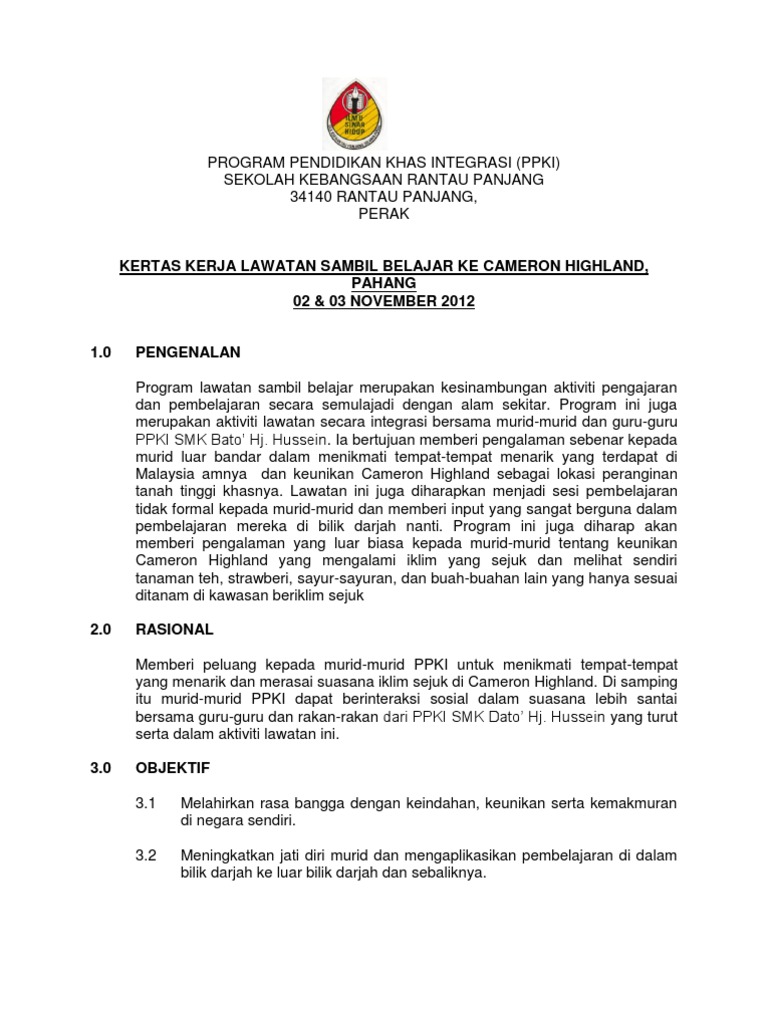 Doc Kertas Kerja Cadangan Lawatan Sambil Belajar Program Pendidikan Khas Integrasi Ke Cameron Highland Zanina Zaki Academia Edu