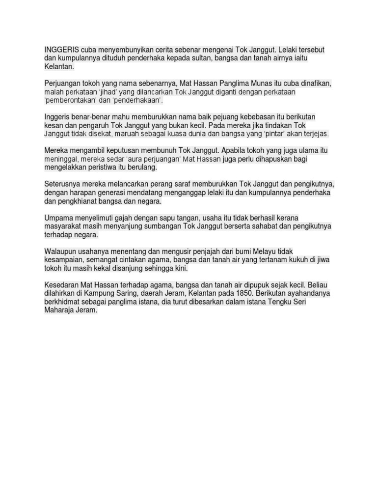 Kesan peristiwa penentangan tok janggut. Tok janggut atau haji mat hassan i latar belakang tok janggut atau haji mat hassan nama sebenar haji mat hassan bin munas dikenali sebagai tok janggut kerana beliau menyimpan janggut hingga ke paras dada dilahirkan tahun 1853 di kampung jeram pasir puteh kelantan mendapat pendidikan pondok di kelantan dan makkah mahir dalam ilmu persilatan menetap di kampung nering. Tok janggut nama sebenar. 1850 tempat lahir.