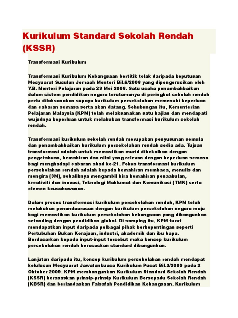 Kurikulum Standard Sekolah Rendah Kssr Transformasi