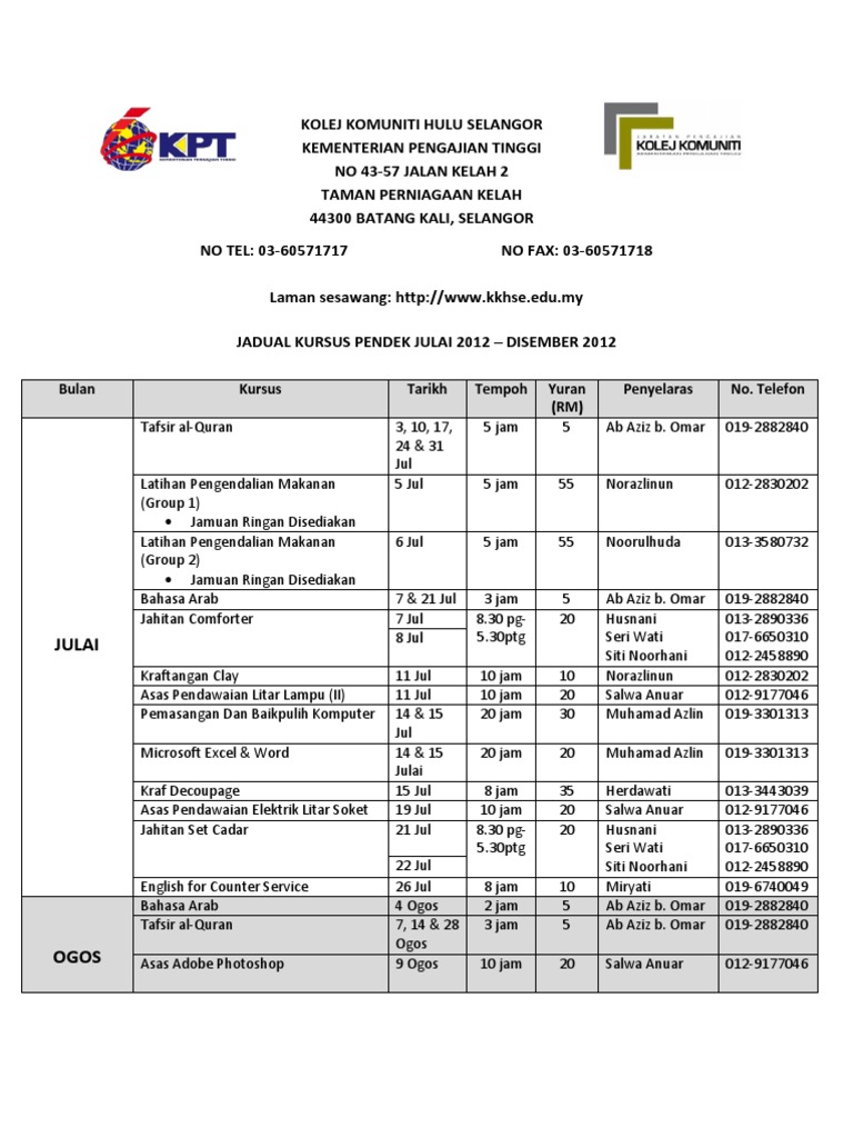 Takwim Kursus Pendek Mac Dah Keluar Kolej Komuniti Hulu Selangor Fan Page Rasmi Facebook