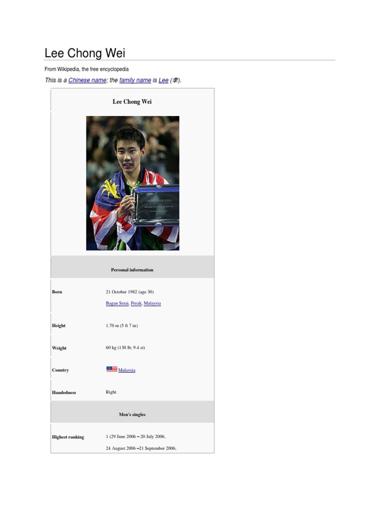 Lee chong wei was born on 21 october 1982 in bagan serai perak. Kemuncak kariernya ialah pada tahun 2006 dimana ketika beliau berjaya merangkul gelaran ranking. Pada pusingan kedua chong tewas kepada pemain dari republik rakyat china chen hong.