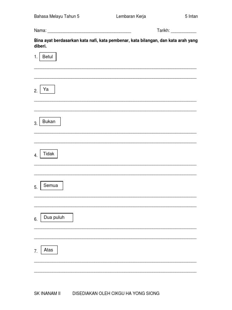 Lembaran Kerja Kata Nafi Kata Arah Kata Bilangan Dan Kata Pembenar