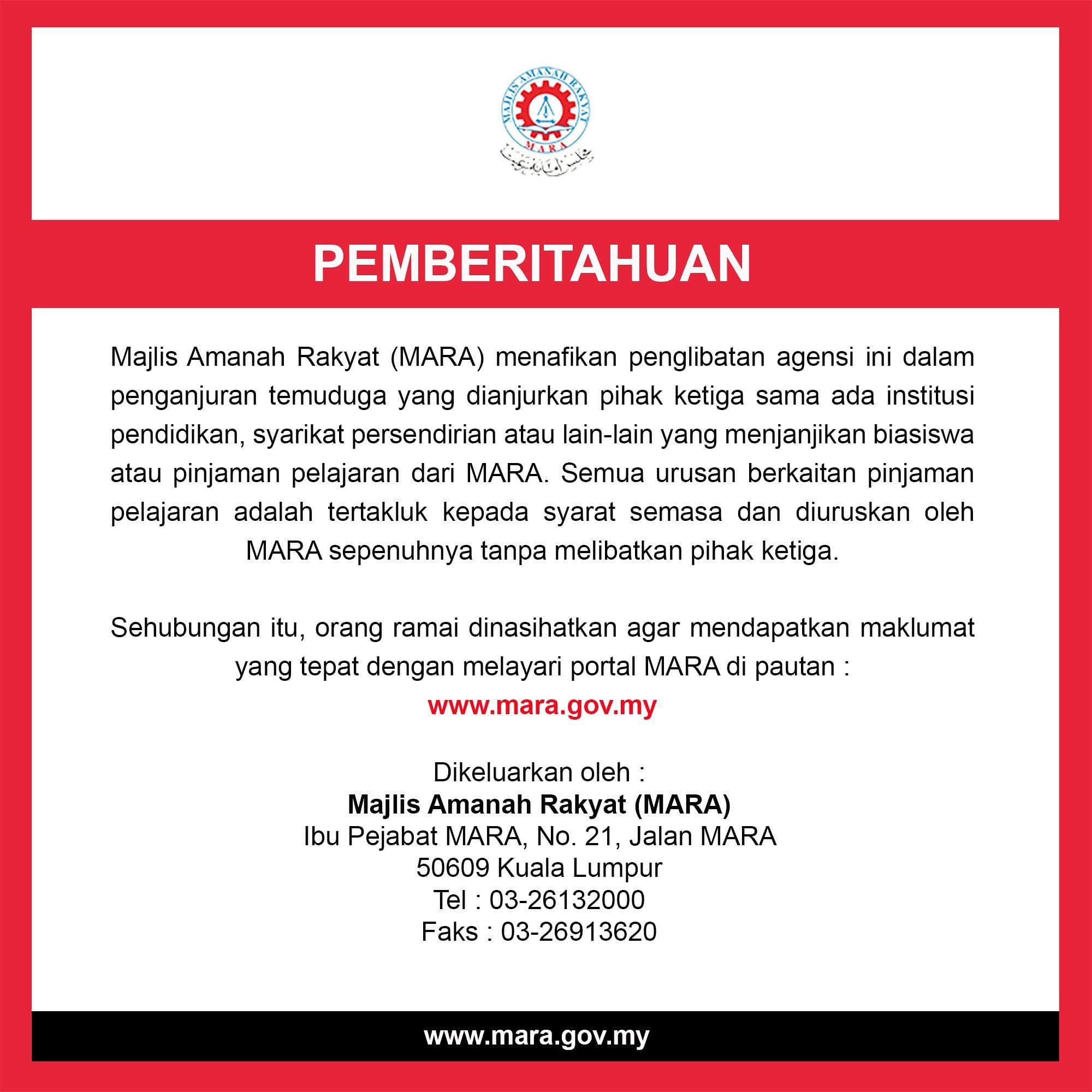 Majlis Amanah Rakyat Twitterissa Majlis Amanah Rakyat Mara Menafikan Penglibatan Agensi Ini Dalam Penganjuran Temuduga Yang Dianjurkan Pihak Ketiga Sama Ada Institusi Pendidikan Syarikat Persendirian Atau Lain Lain Yang Menjanjikan Biasiswa Atau