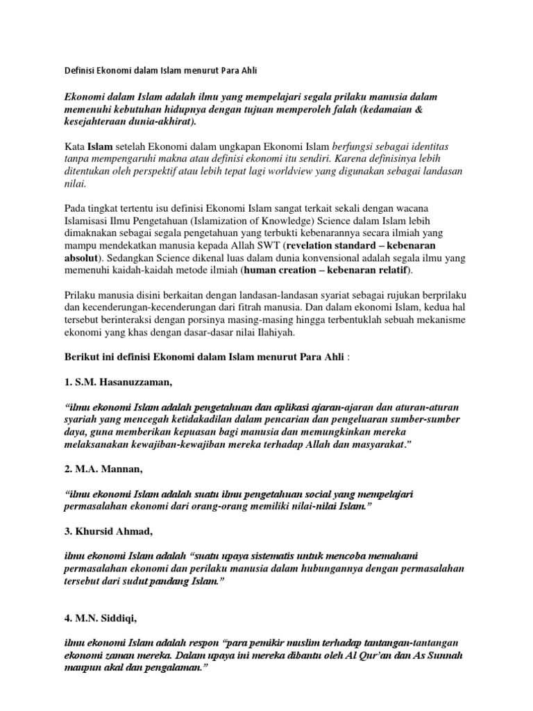 Definisi Ekonomi Dalam Islam Menurut Para Ahli