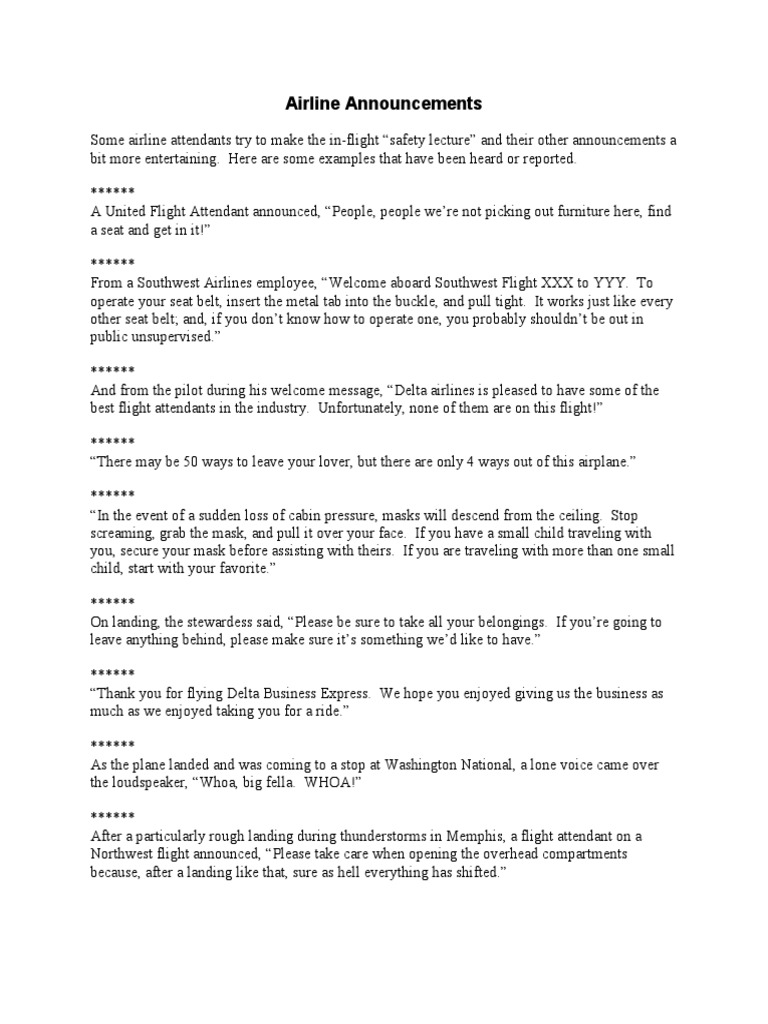 Airline Announcements Pdf Flight Attendant Airlines